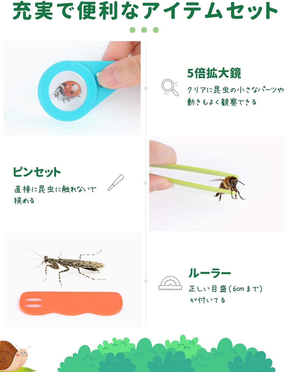 虫 観察 ケース-438円 lqu トリプル拡大鏡 拡大観察ケース 昆虫観察キット 昆虫ビューア 1個 3倍 昆虫学者 子供のおもちゃ 拡大ボックス 贈り物 虫眼鏡 教育道具 花葉 知育玩具 昆虫観察 おもちゃ 知育・学習玩具 科学・サイエンス 生態・採集この夏は虫の観察をしてみよう。 1個 ¥638/個(税込価格) サイズW178×D114×H127mm 重 量約180g 素 材ふた:PP、透明ケース:PS ECM001a5 虫取りカゴ ちゃっぷんランド 内蓋付きで水が外に漏れにくい! ザリガニ・おたまじゃくし等、水辺の生き物を採るのに最適。 しっかりとしたベルト付きで丈夫です。 1個 ¥0/個(税込価格) サイズW225×D123×H153mm 重 量